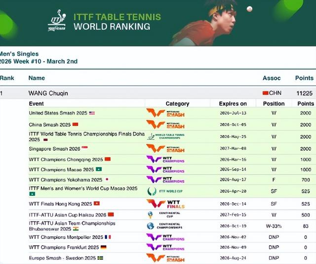 王楚钦这六场比赛:3-0卢伟、3-0户上隼辅、3-1林德、4-0张禹珍、4-1小勒布伦、4-0林昀儒,大满贯单打积分2000,王楚钦总积分11225再度破万。